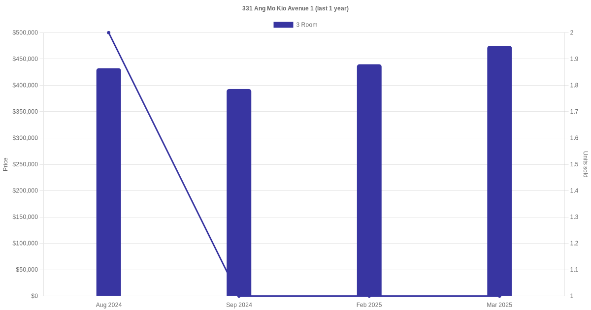 | Sep 2025 | $1,800 | 3 Room | Blk 331 Ang Mo Kio Avenue 1 3 Room | Ang Mo Kio |
