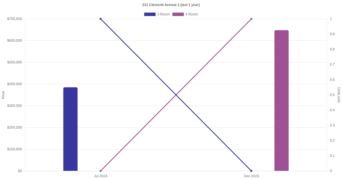 Below is a quick summary of the resale transactions volume and average price trends for the 3 room and 4 room units at 331 Clementi Avenue 2.