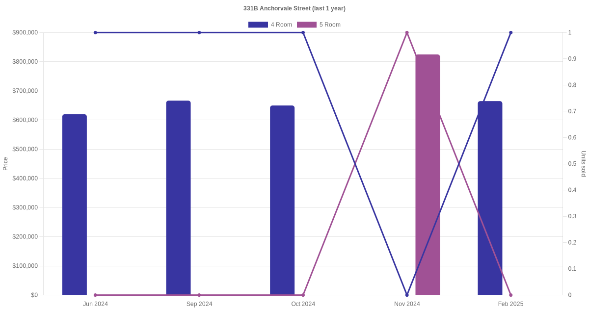 Below is a quick summary of the resale transactions volume and average price trends for the 4 room and 5 room units at 331B Anchorvale Street.