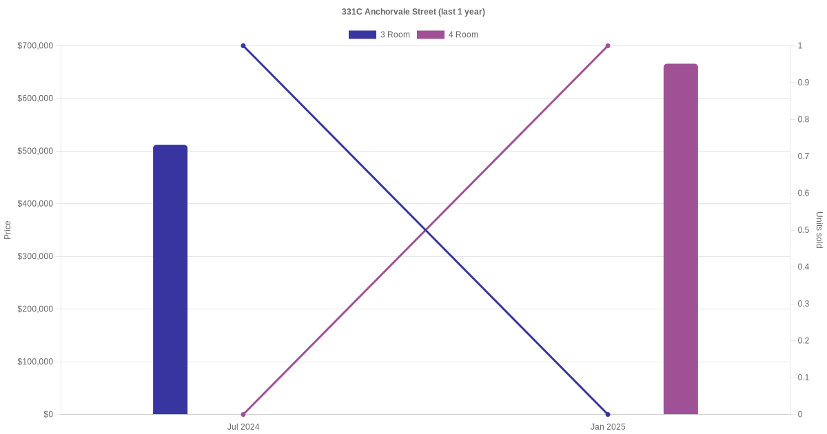 Below is a quick summary of the resale transactions volume and average price trends for the 3 room and 4 room units at 331C Anchorvale Street.
