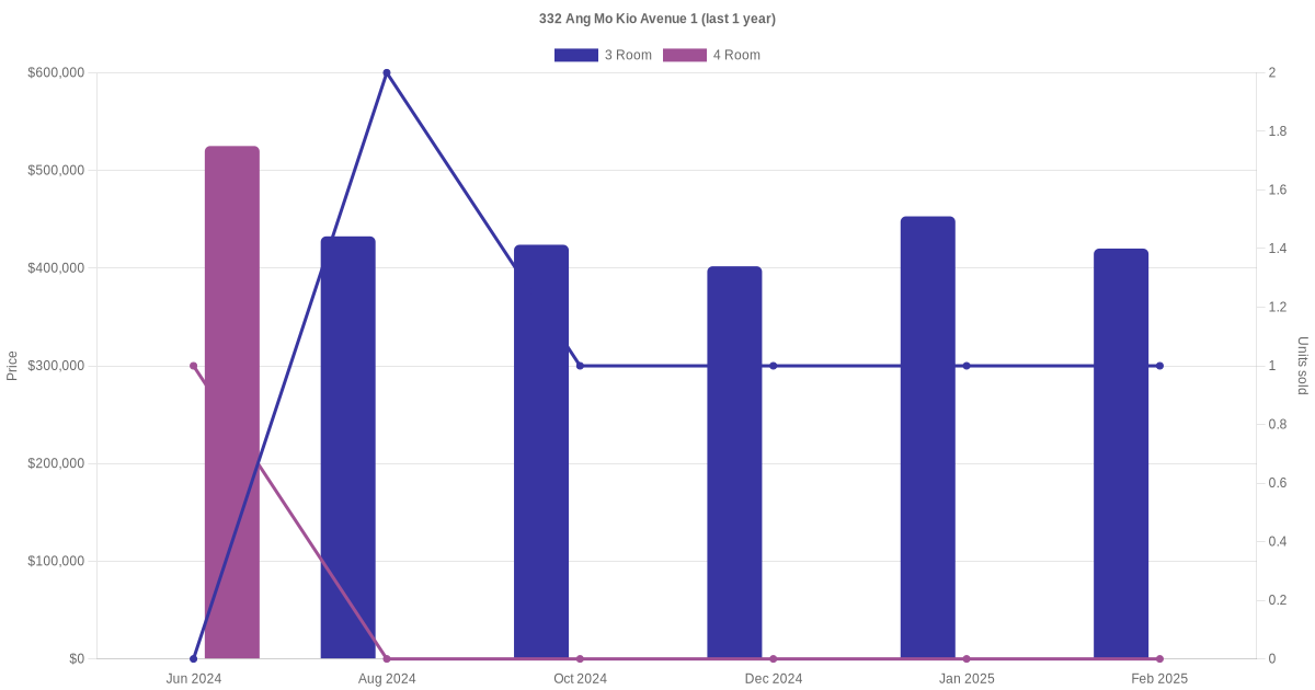 Below is a quick summary of the resale transactions volume and average price trends for the 3 room and 4 room units at 332 Ang Mo Kio Avenue 1.