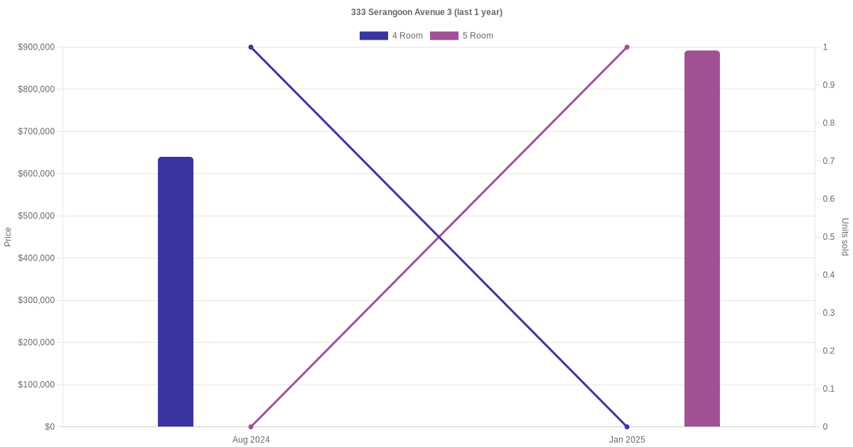 Below is a quick summary of the resale transactions volume and average price trends for the 4 room and 5 room units at 333 Serangoon Avenue 3.