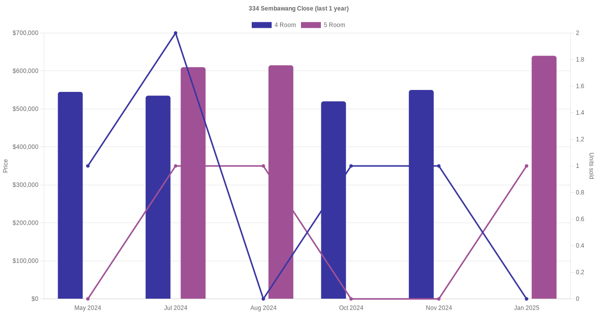 Below is a quick summary of the resale transactions volume and average price trends for the 4 room and 5 room units at 334 Sembawang Close.