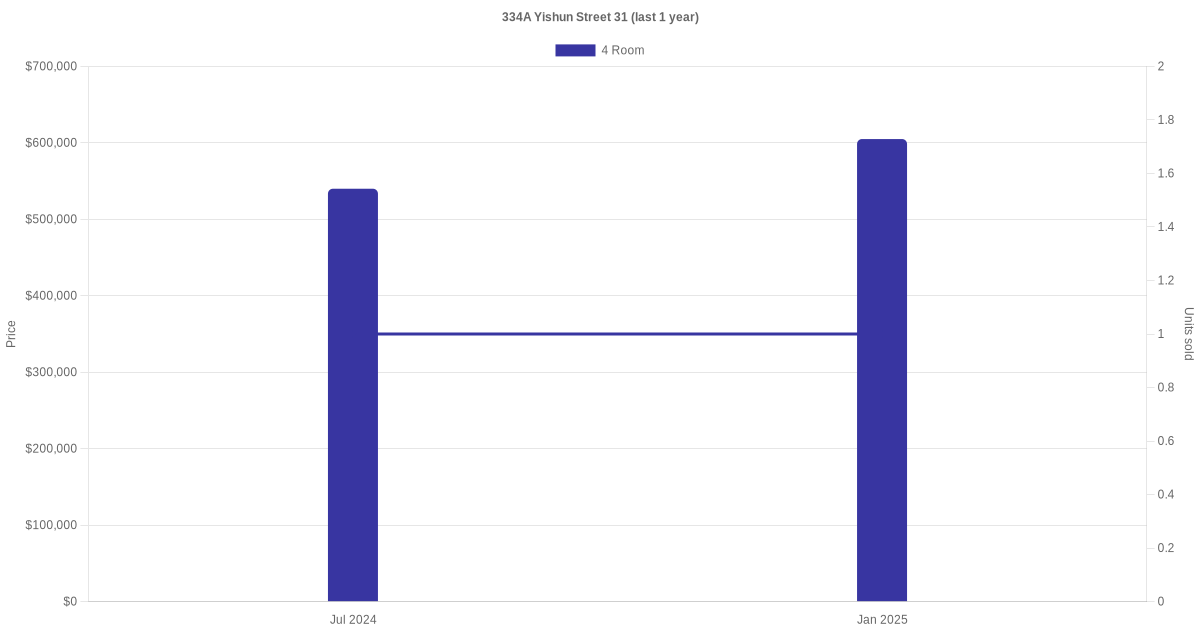 Below is a quick summary of the resale transactions volume and average price trends for the 3 room and 4 room units at 334A Yishun Street 31.