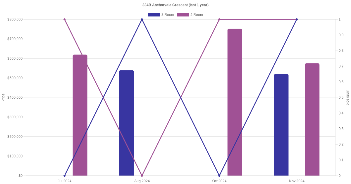 Below is a quick summary of the resale transactions volume and average price trends for the 3 room and 4 room units at 334B Anchorvale Crescent.
