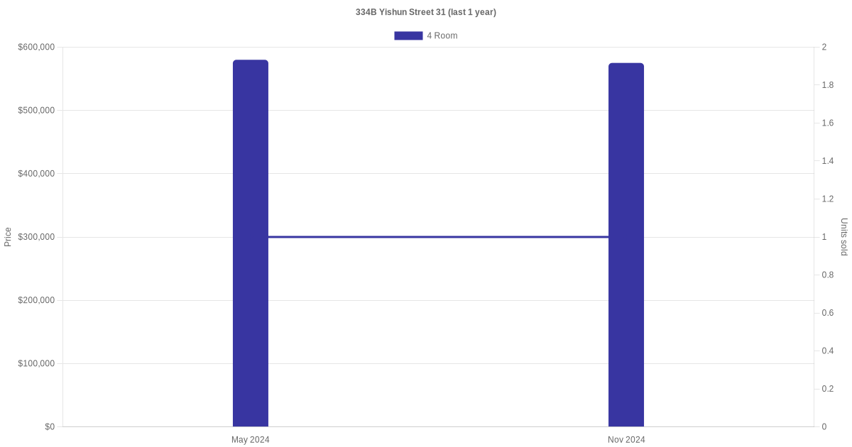 Below is a quick summary of the resale transactions volume and average price trends for the 4 room and 5 room units at 334B Yishun Street 31.