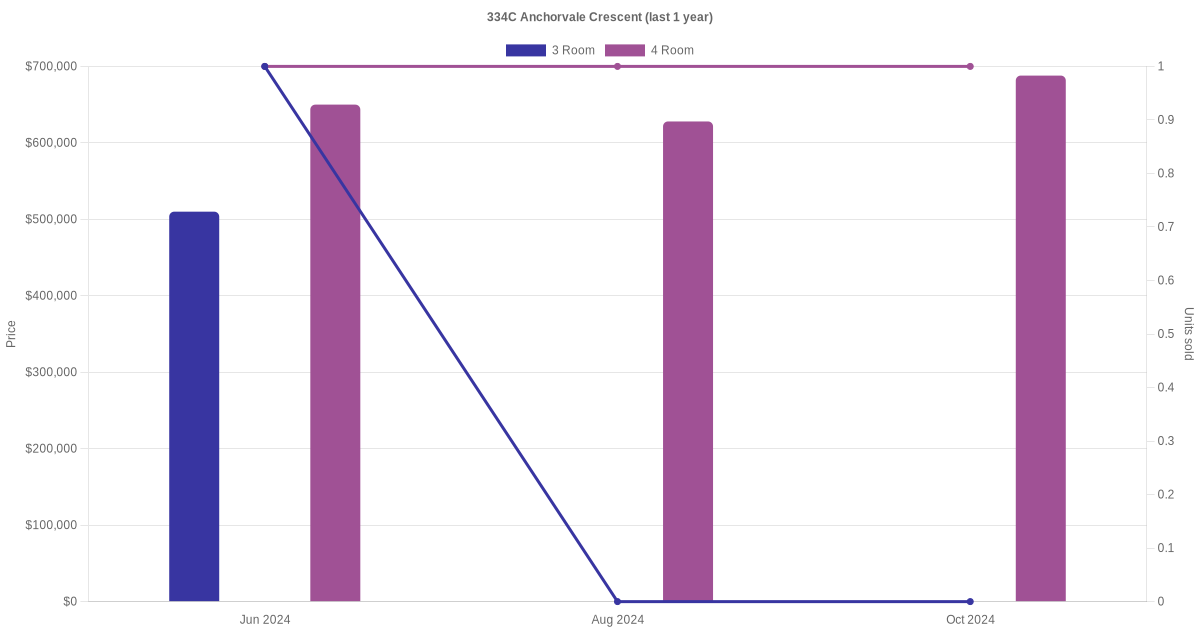 Below is a quick summary of the resale transactions volume and average price trends for the 3 room and 4 room units at 334C Anchorvale Crescent.