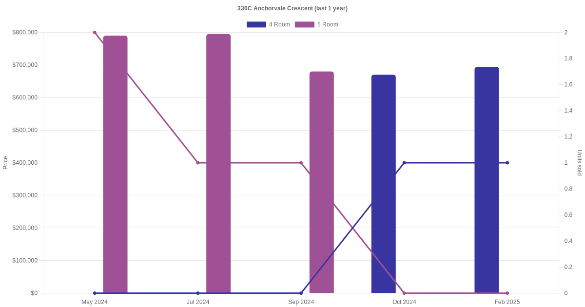 Below is a quick summary of the resale transactions volume and average price trends for the 4 room and 5 room units at 336C Anchorvale Crescent.