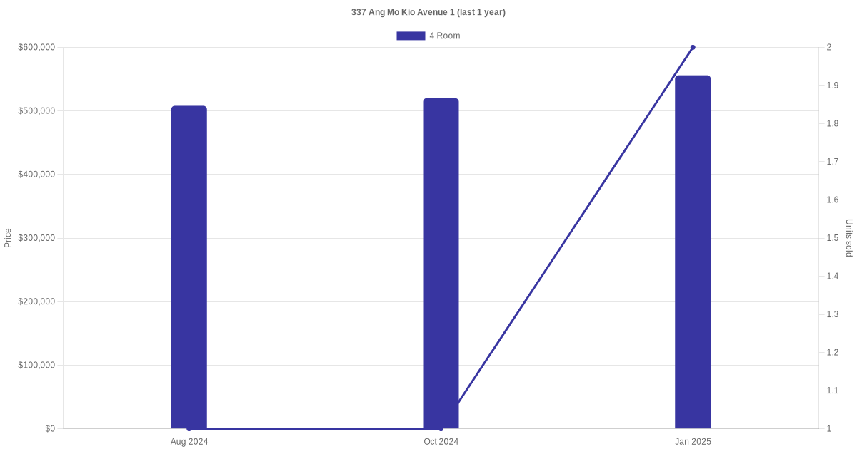 Below is a quick summary of the resale transactions volume and average price trends for the 4 room units at 337 Ang Mo Kio Avenue 1.