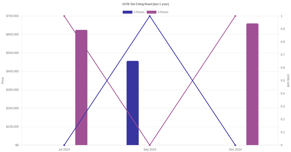 Below is a quick summary of the resale transactions volume and average price trends for the 3 room and 4 room units at 337B Tah Ching Road.