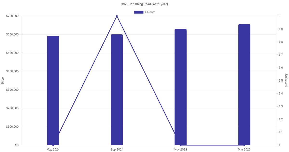 Below is a quick summary of the resale transactions volume and average price trends for the 4 room and 5 room units at 337D Tah Ching Road.