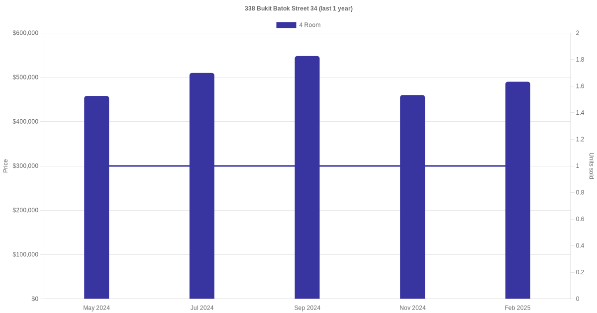Below is a quick summary of the resale transactions volume and average price trends for the 4 room units at 338 Bukit Batok Street 34.