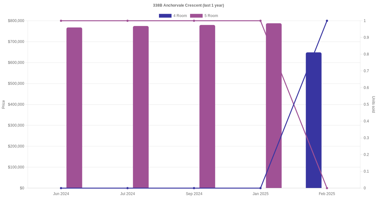 Below is a quick summary of the resale transactions volume and average price trends for the 4 room and 5 room units at 338B Anchorvale Crescent.