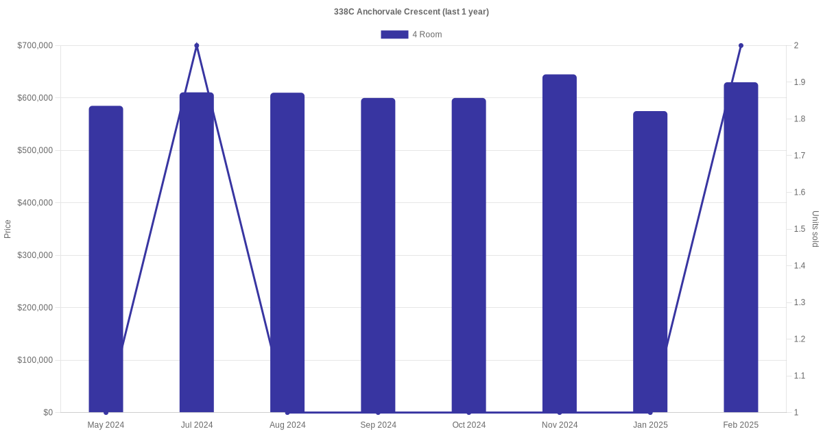 Below is a quick summary of the resale transactions volume and average price trends for the 4 room units at 338C Anchorvale Crescent.