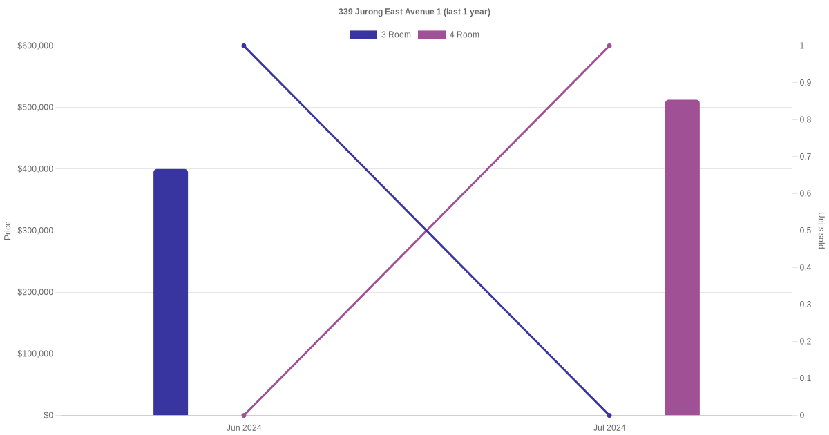 Below is a quick summary of the resale transactions volume and average price trends for the 3 room and 4 room units at 339 Jurong East Avenue 1.