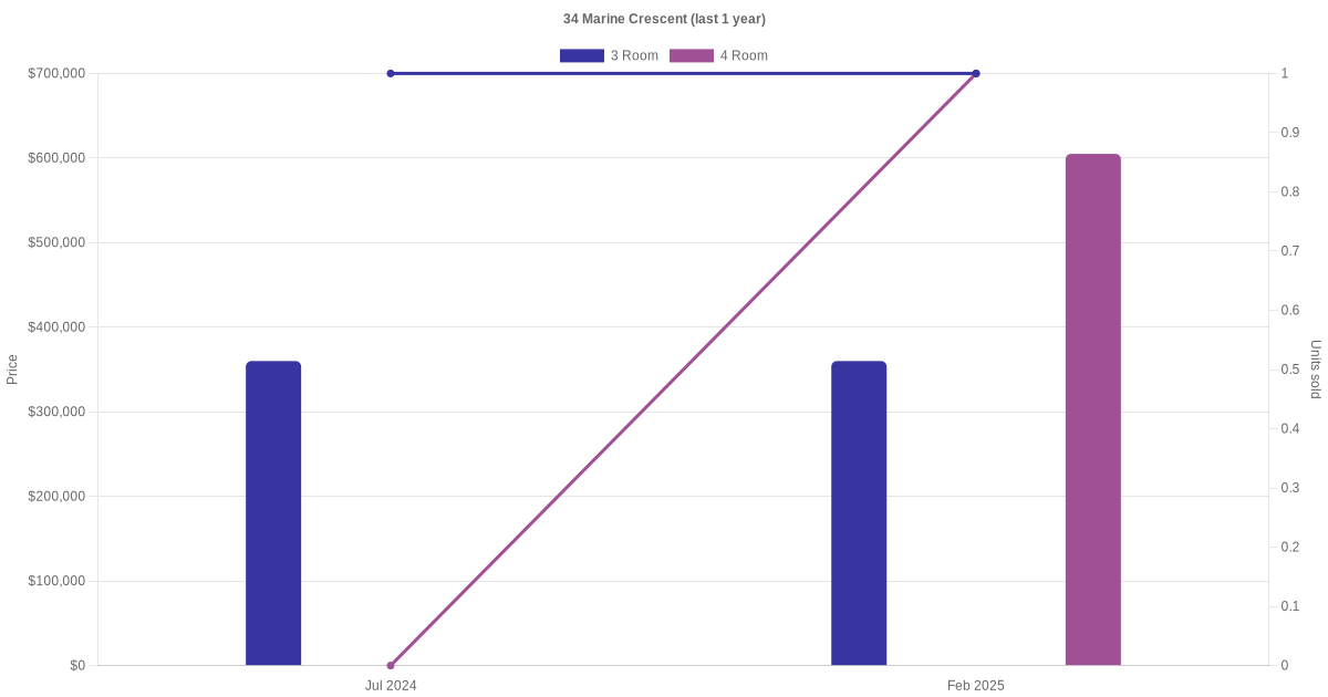 Below is a quick summary of the resale transactions volume and average price trends for the 3 room and 4 room units at 34 Marine Crescent.