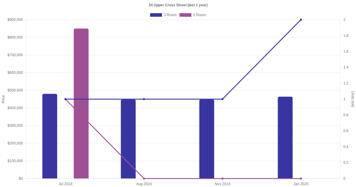 Below is a quick summary of the resale transactions volume and average price trends for the 3 room and 5 room units at 34 Upper Cross Street.