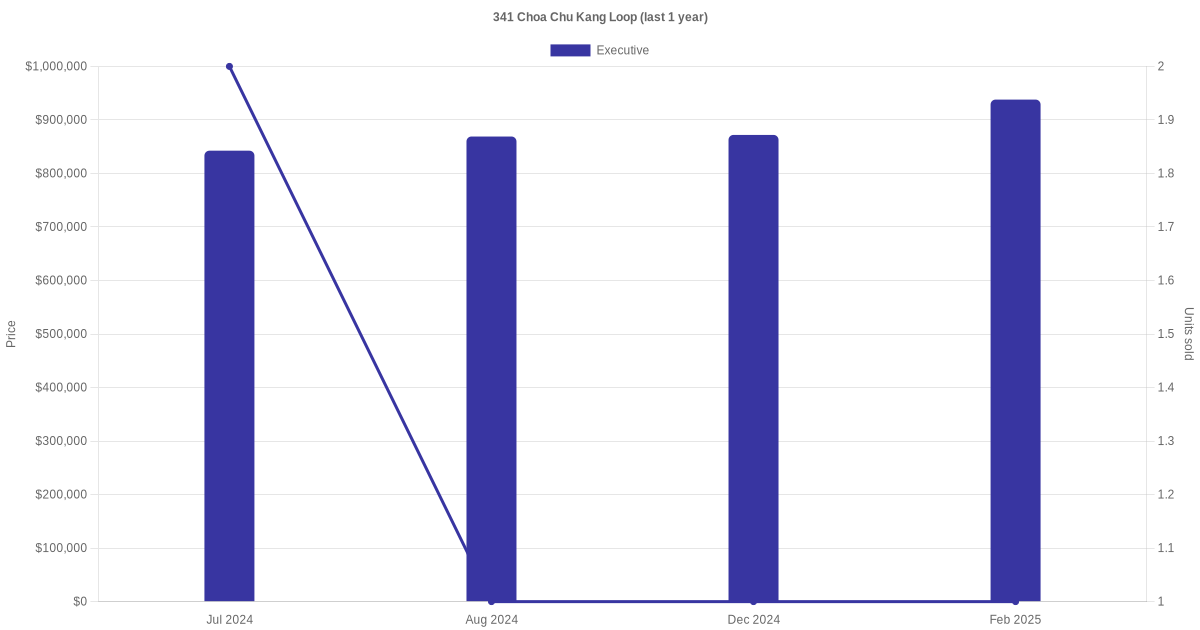 Below is a quick summary of the resale transactions volume and average price trends for the executive units at 341 Choa Chu Kang Loop.