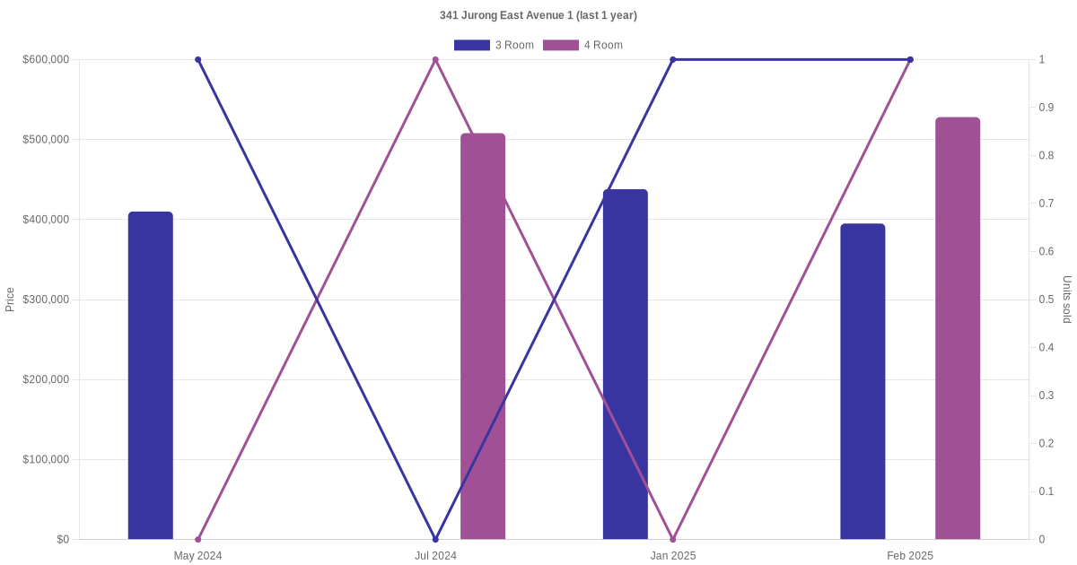 Below is a quick summary of the resale transactions volume and average price trends for the 3 room and 4 room units at 341 Jurong East Avenue 1.