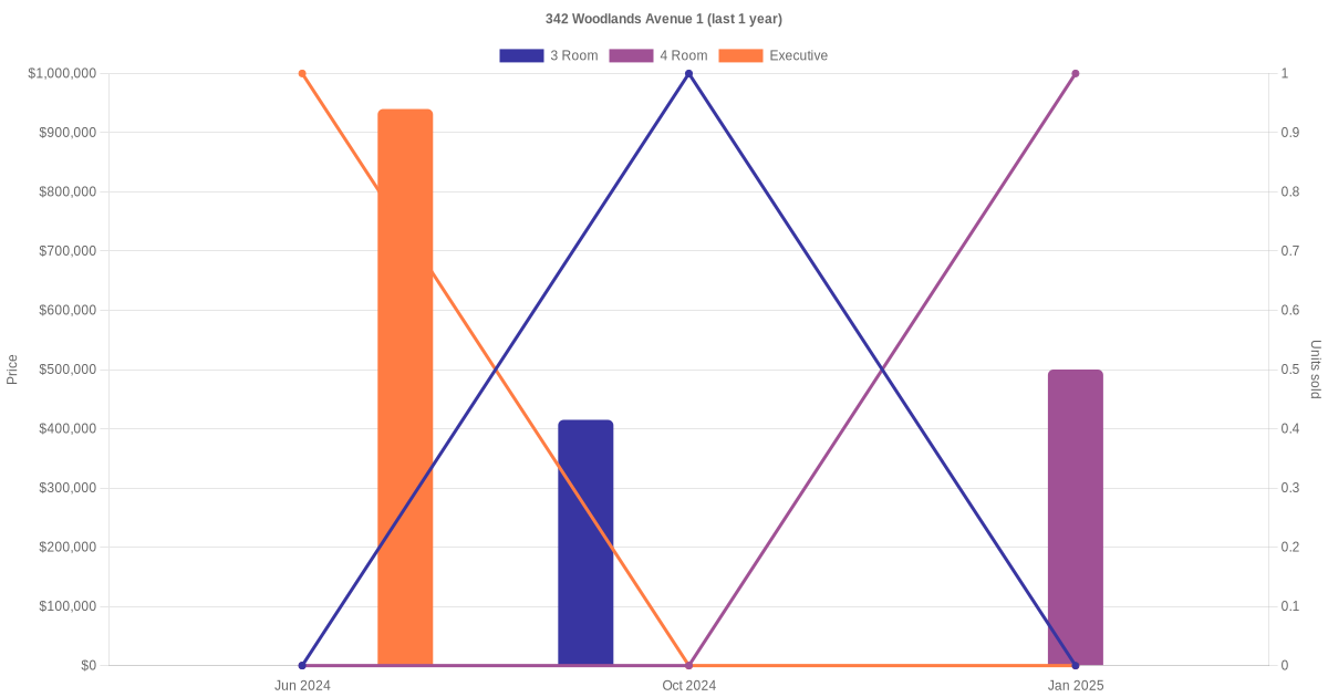 Here's a summary of the rental transactions and price trends for the 3 room, 4 room and executive units at 342 Woodlands Avenue 1.