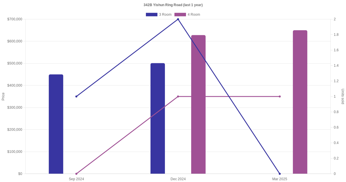 Below is a quick summary of the resale transactions volume and average price trends for the 3 room and 4 room units at 342B Yishun Ring Road.