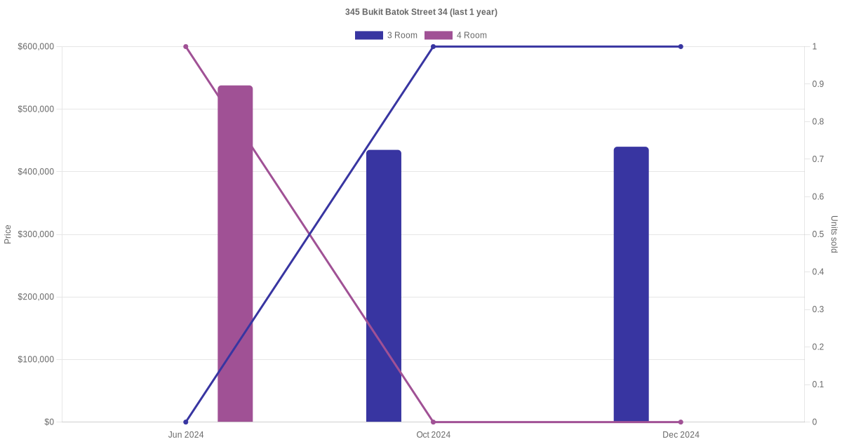 Below is a quick summary of the resale transactions volume and average price trends for the 3 room and 4 room units at 345 Bukit Batok Street 34.