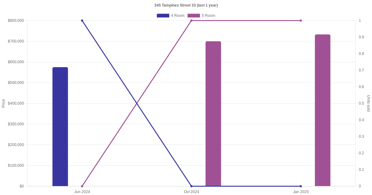 Below is a quick summary of the resale transactions volume and average price trends for the 4 room and 5 room units at 345 Tampines Street 33.