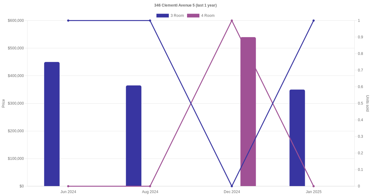 Here's a summary of the rental transactions and price trends for the 3 room and 4 room units at 346 Clementi Avenue 5.