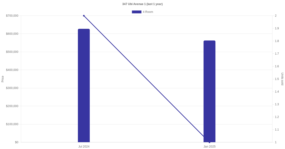Below is a quick summary of the resale transactions volume and average price trends for the 4 room units at 347 Ubi Avenue 1.