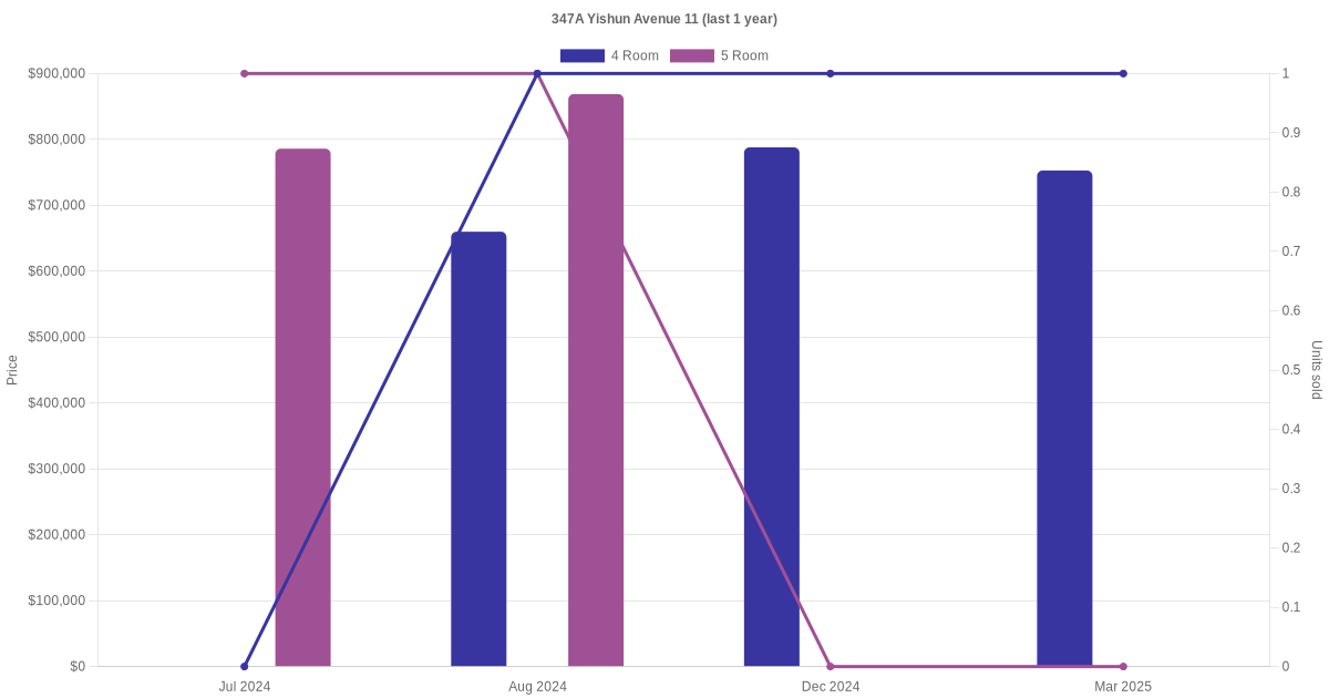Below is a quick summary of the resale transactions volume and average price trends for the 3 room, 4 room and 5 room units at 347A Yishun Avenue 11.