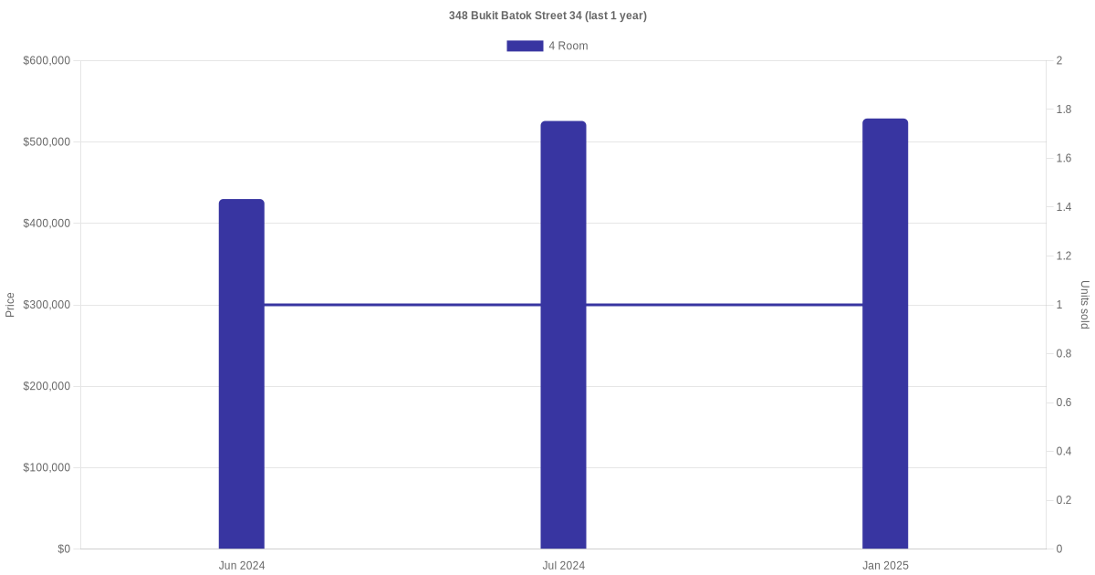 Below is a quick summary of the resale transactions volume and average price trends for the 4 room and 5 room units at 348 Bukit Batok Street 34.