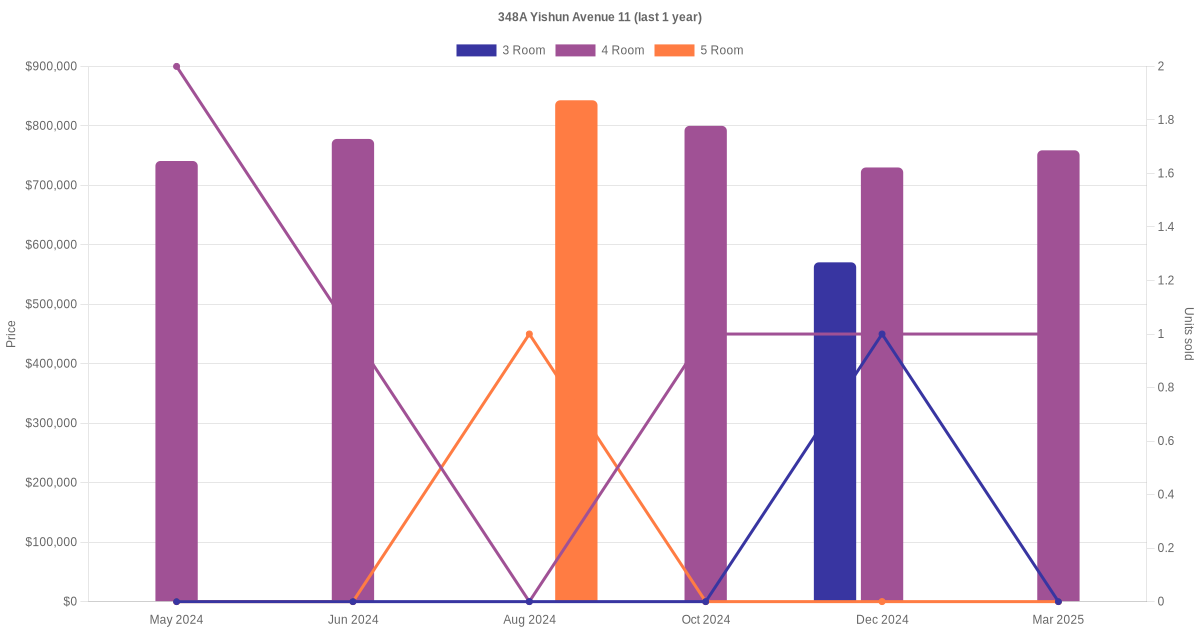 Below is a quick summary of the resale transactions volume and average price trends for the 3 room, 4 room and 5 room units at 348A Yishun Avenue 11.