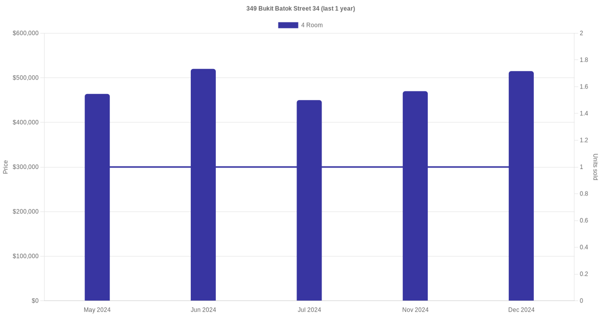 Below is a quick summary of the resale transactions volume and average price trends for the 4 room units at 349 Bukit Batok Street 34.