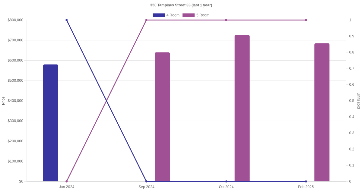 Below is a quick summary of the resale transactions volume and average price trends for the 4 room and 5 room units at 350 Tampines Street 33.