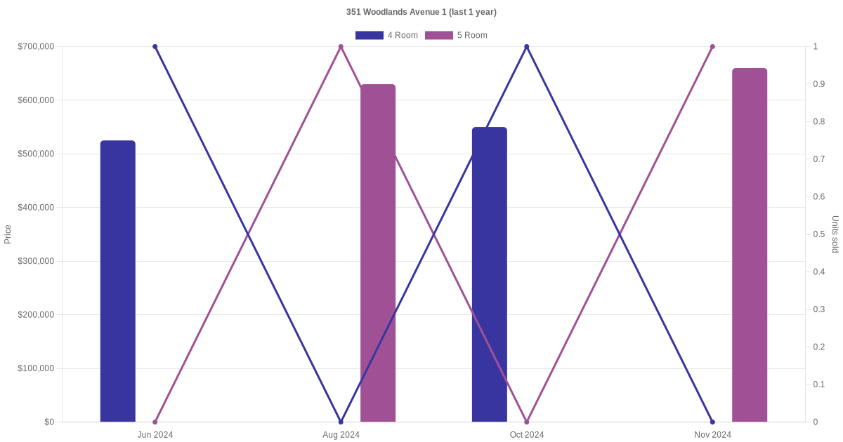 Below is a quick summary of the resale transactions volume and average price trends for the 4 room and 5 room units at 351 Woodlands Avenue 1.