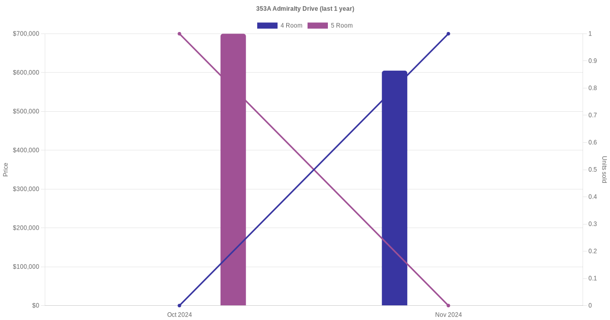 Below is a quick summary of the resale transactions volume and average price trends for the 4 room and 5 room units at 353A Admiralty Drive.