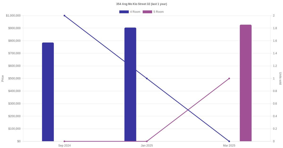 Below is a quick summary of the resale transactions volume and average price trends for the 4 room and 5 room units at 354 Ang Mo Kio Street 32.