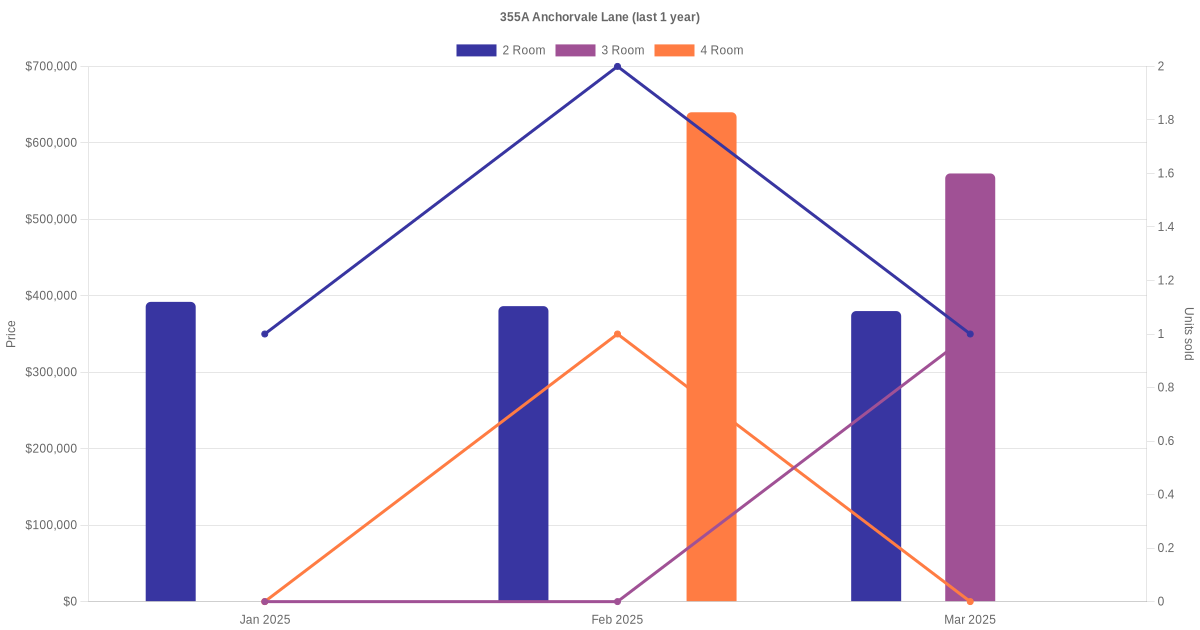 Below is a quick summary of the resale transactions volume and average price trends for the 2 room, 3 room and 4 room units at 355A Anchorvale Lane.