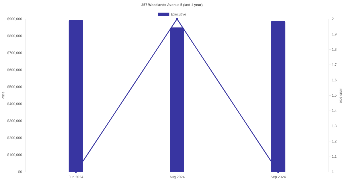 Below is a quick summary of the resale transactions volume and average price trends for the executive units at 357 Woodlands Avenue 5.