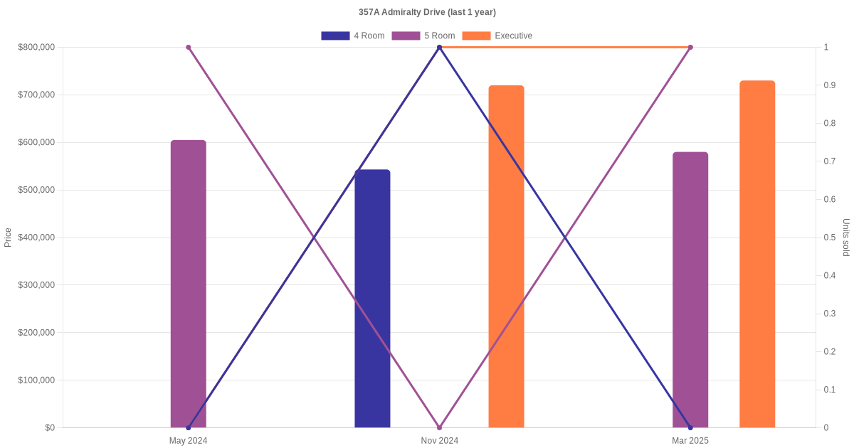 Below is a quick summary of the resale transactions volume and average price trends for the 4 room, 5 room and executive units at 357A Admiralty Drive.