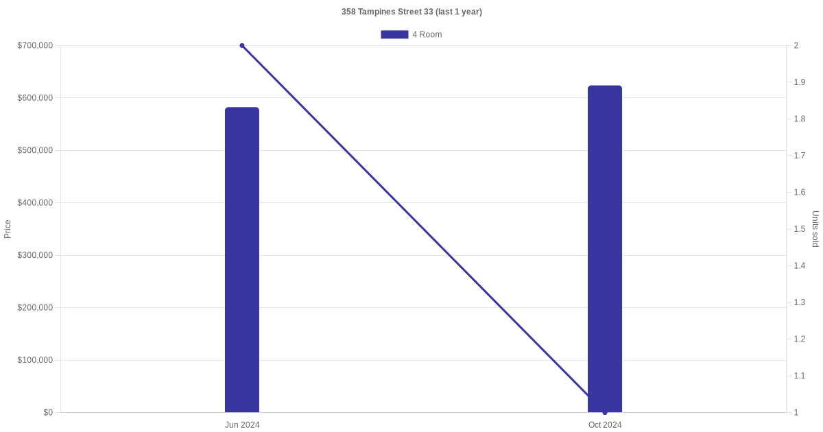 There were a total of 4 resale transactions in the last 3 years for units in block 358 Tampines Street 33, with the latest one recorded in Oct 2024.