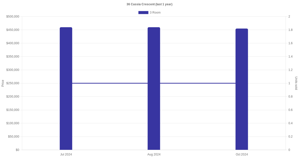 Below is a quick summary of the resale transactions volume and average price trends for the 3 room units at 36 Cassia Crescent.