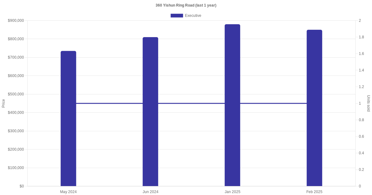 Below is a quick summary of the resale transactions volume and average price trends for the executive units at 360 Yishun Ring Road.