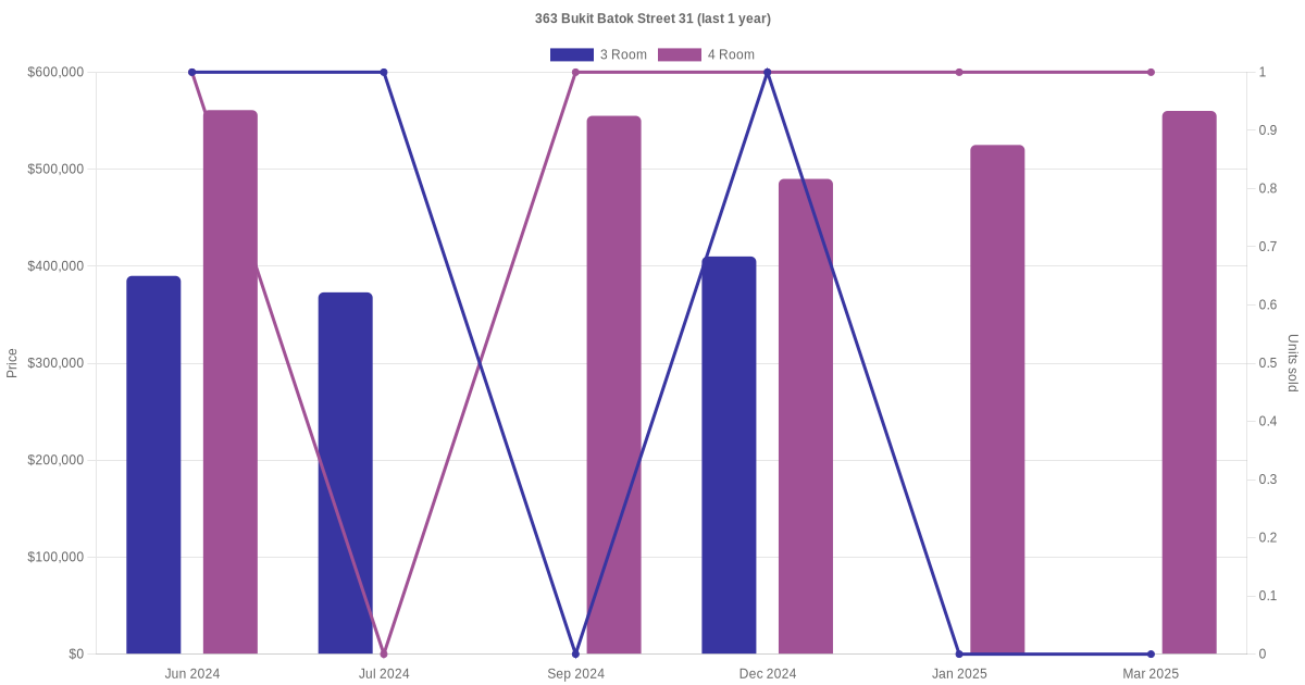 Below is a quick summary of the resale transactions volume and average price trends for the 3 room and 4 room units at 363 Bukit Batok Street 31.