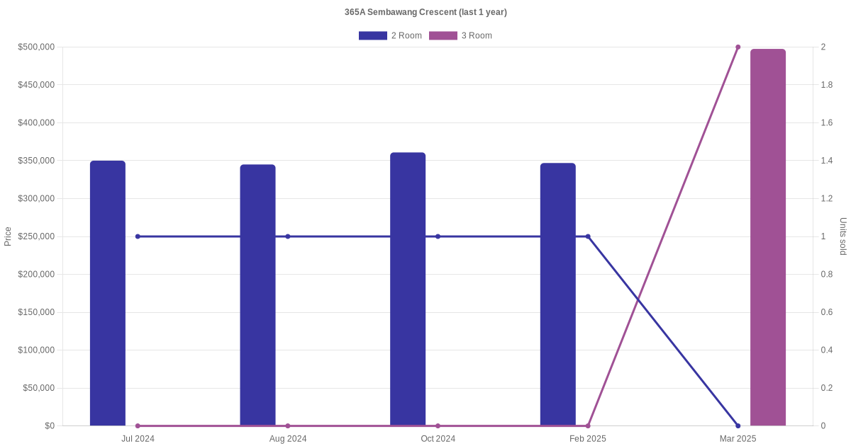 Here's a summary of the rental transactions and price trends for the 2 room, 3 room and 4 room units at 365A Sembawang Crescent.