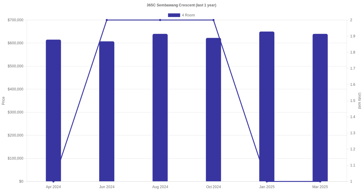 Below is a quick summary of the resale transactions volume and average price trends for the 3 room and 4 room units at 365C Sembawang Crescent.