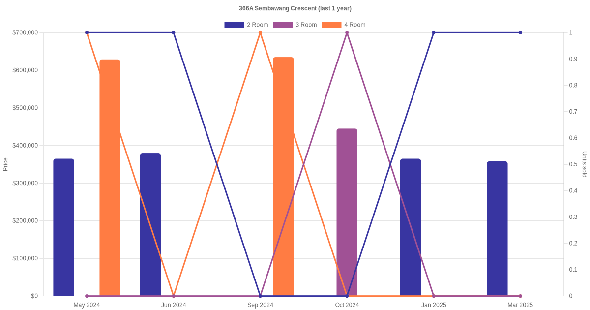 Below is a quick summary of the resale transactions volume and average price trends for the 2 room, 3 room and 4 room units at 366A Sembawang Crescent.