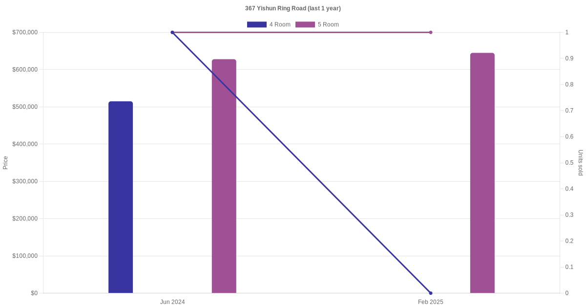Below is a quick summary of the resale transactions volume and average price trends for the 4 room and 5 room units at 367 Yishun Ring Road.