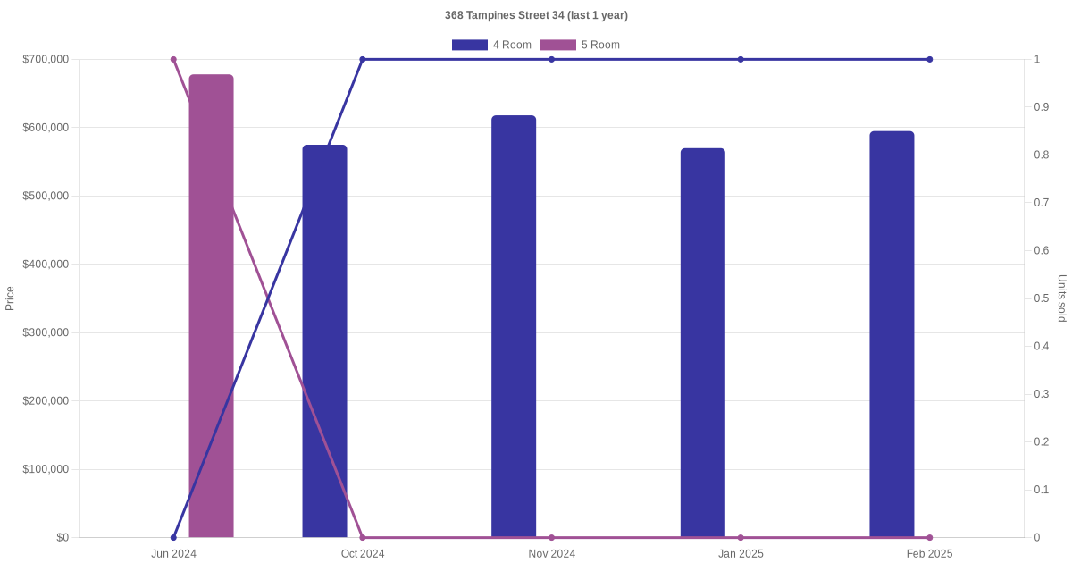 Below is a quick summary of the resale transactions volume and average price trends for the 4 room and 5 room units at 368 Tampines Street 34.