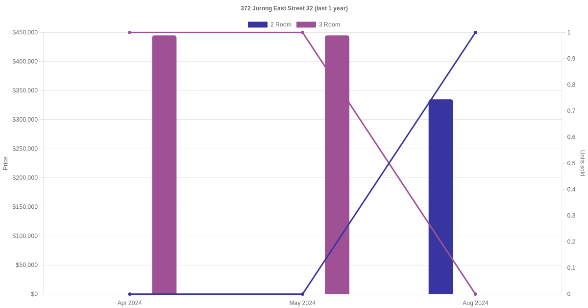 | Apr 2025 | $2,400 | 2 Room | Blk 372 Jurong East Street 32 2 Room | Jurong East |